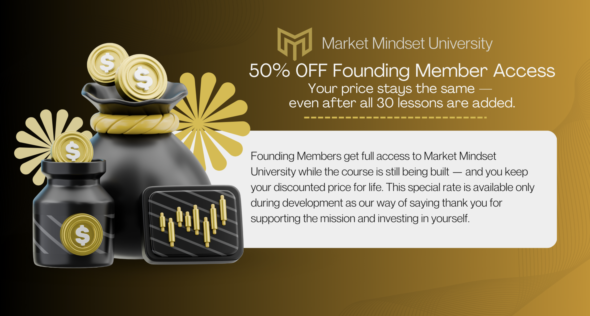 Founding Member Lifetime Access — pay once and own it forever. Enjoy 50% off during development as new lessons are added. One-Time Payment — 50% OFF (normally $298)